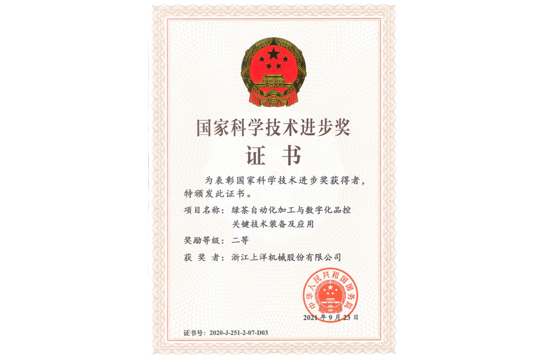 2021年11月3日,公司與安徽農(nóng)業(yè)大學(xué)等單位聯(lián)合申報(bào)的《綠茶自動(dòng)化加工與數(shù)字化品控關(guān)鍵技術(shù)裝備及應(yīng)用》獲得國(guó)家科學(xué)技術(shù)進(jìn)步獎(jiǎng)二等獎(jiǎng)。公司按照“品控?cái)?shù)字化-加工自動(dòng)化-技術(shù)體系化”思路,歷經(jīng)14年攻關(guān)和應(yīng)用,獲獎(jiǎng)項(xiàng)目技術(shù)及裝備推廣至我國(guó)所有產(chǎn)茶?。ㄊ小^(qū))的 1200 多家茶葉企業(yè)。